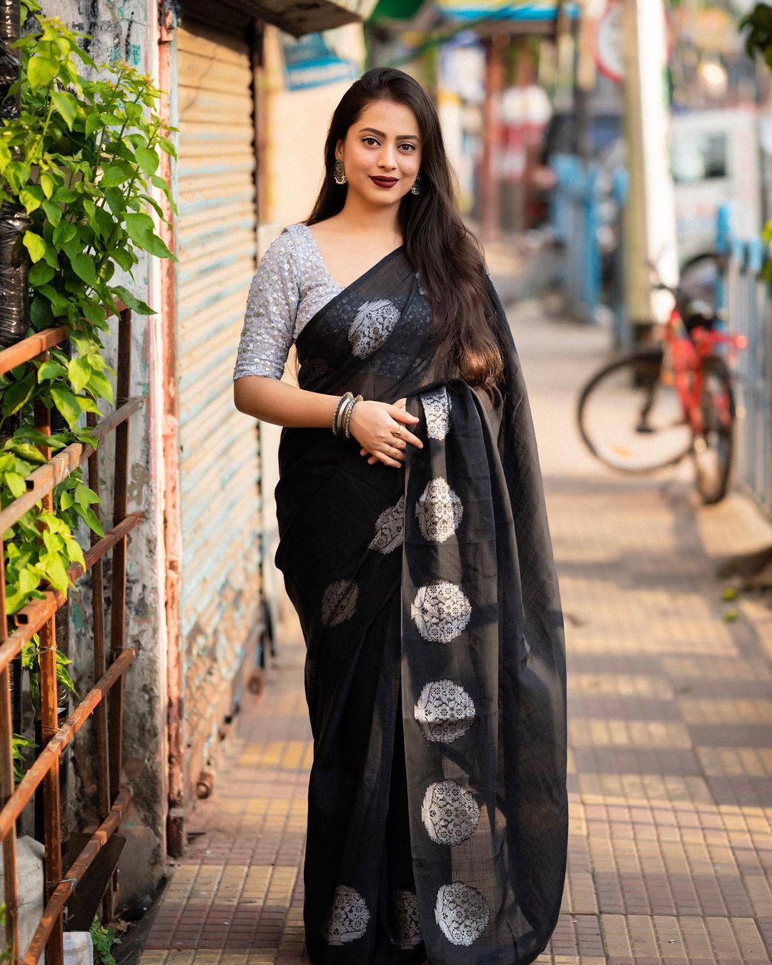 Linen saree with woven zari jacq design allover on both side. Cotton tassels on pallu. super heavy gold zari & sequence embroidery .Best fit for the party and occasion.